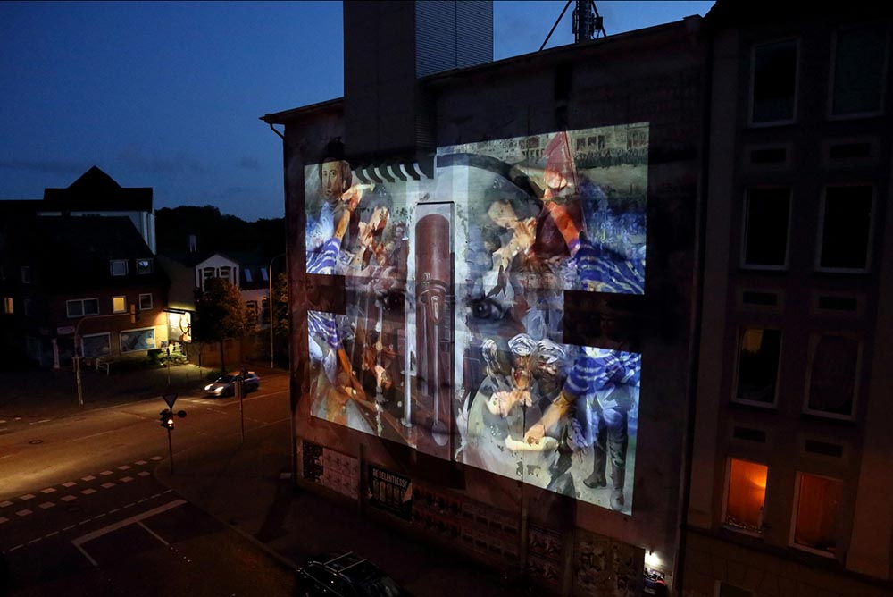 Dialog zwischen traditioneller Malerei (Wandgemälde „Revolution und Krieg“) und medialer Gegenwartskunst (Videoprojektion „Aus dieser Asche steigt kein Phönix“)